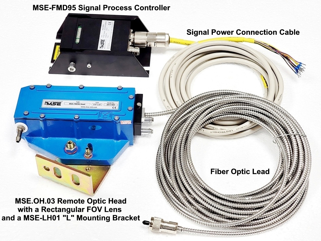 The Model MSE-FMD95 Remote Fiber Digital Hot Metal Detector Sensor Signal Processor Controller and a MSE.OH.03 Remote Optic Head with a Rectangular FOV Lens and a MSE-LH01 "L" Mounting Bracket. (Click Image above for larger image.) |